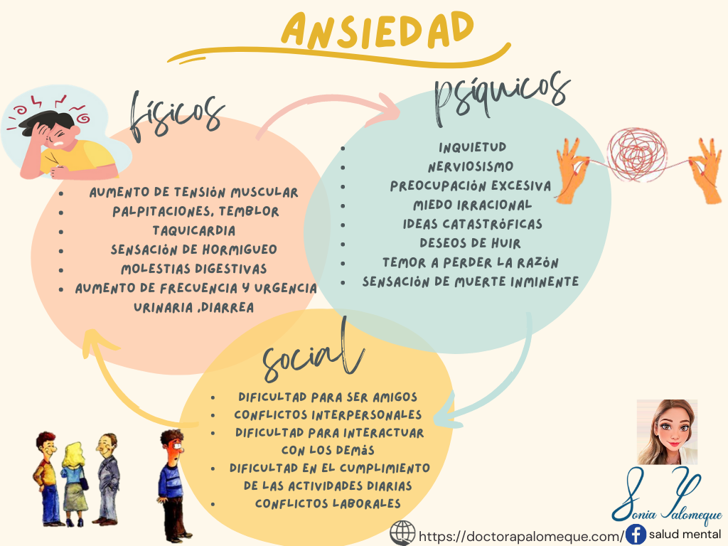 La ansiedad son un grupo de trastornos neuróticos, secundarios a situaciones estresantes y somatomorfos, los cuales se producen ante ciertas situaciones bien definidas. Manifestándose con como un sentimiento de miedo excesivo e inquietud, sudoración, preocupación excesiva, tenso, palpitaciones, entre otros síntomas; La alteración causa, malestar clínicamente significativo o deterioro en lo social, académico, laboral u otras áreas importantes del funcionamiento